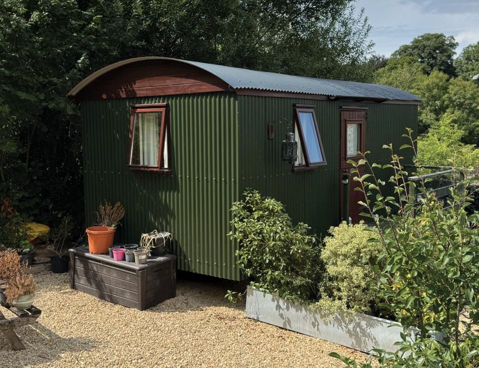 A picturesque shepherd’s hut set up in our lovely garden with stunning views across the village.